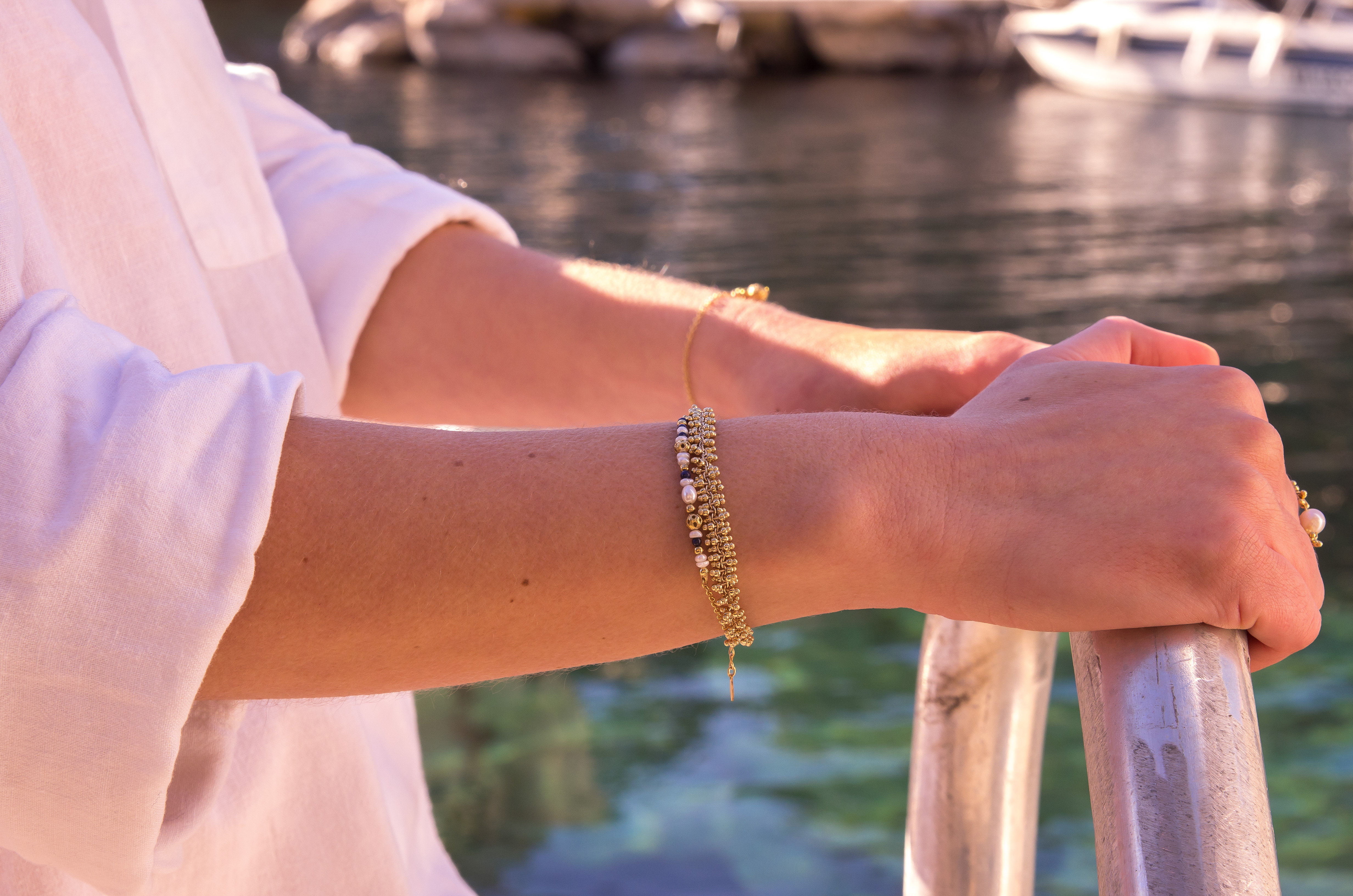 Bracelet double chaîne doré à l’or fin 24 carats. Perles dorées, perles d’eau douce et corail saumon (pierres naturelles).