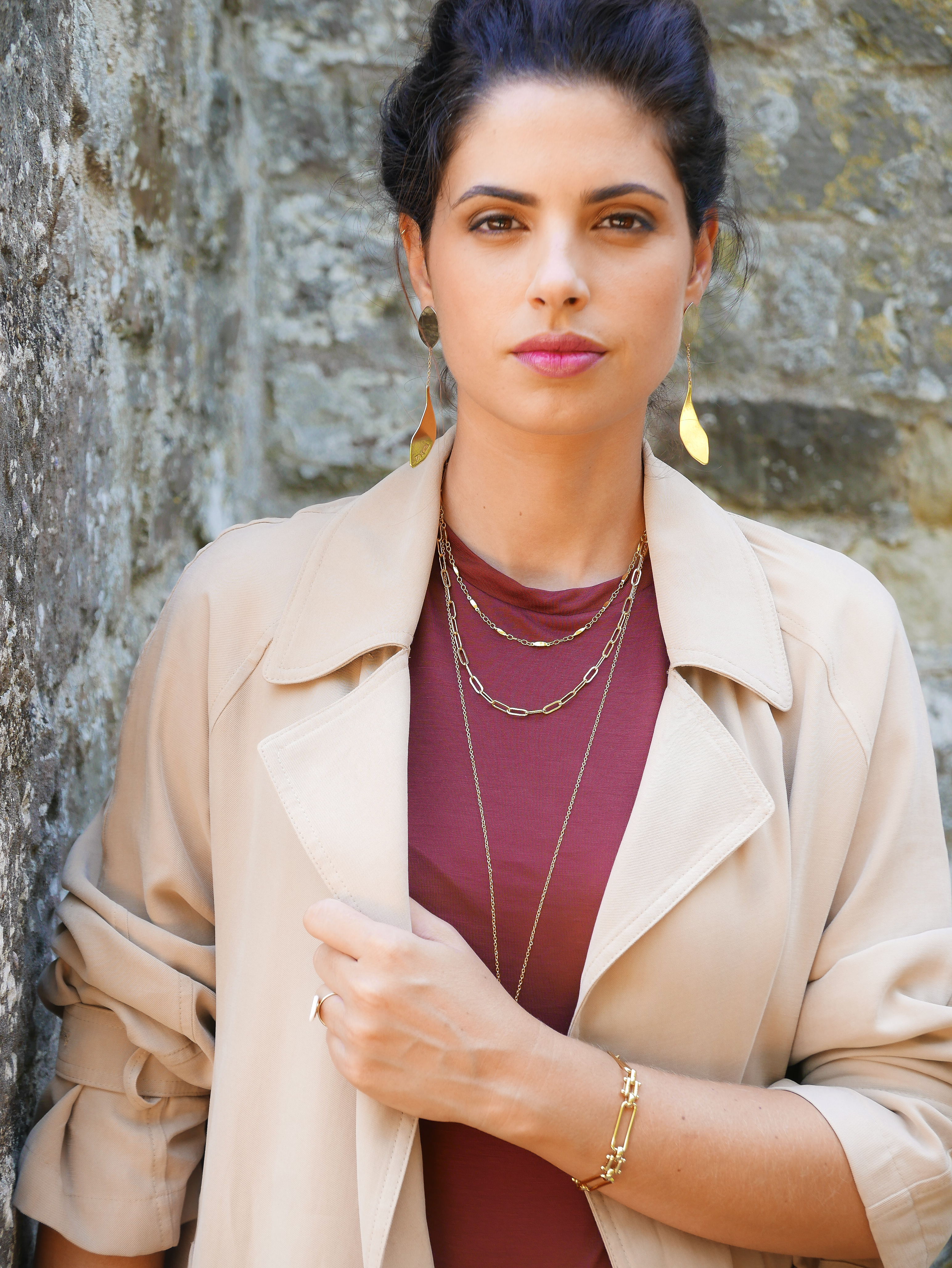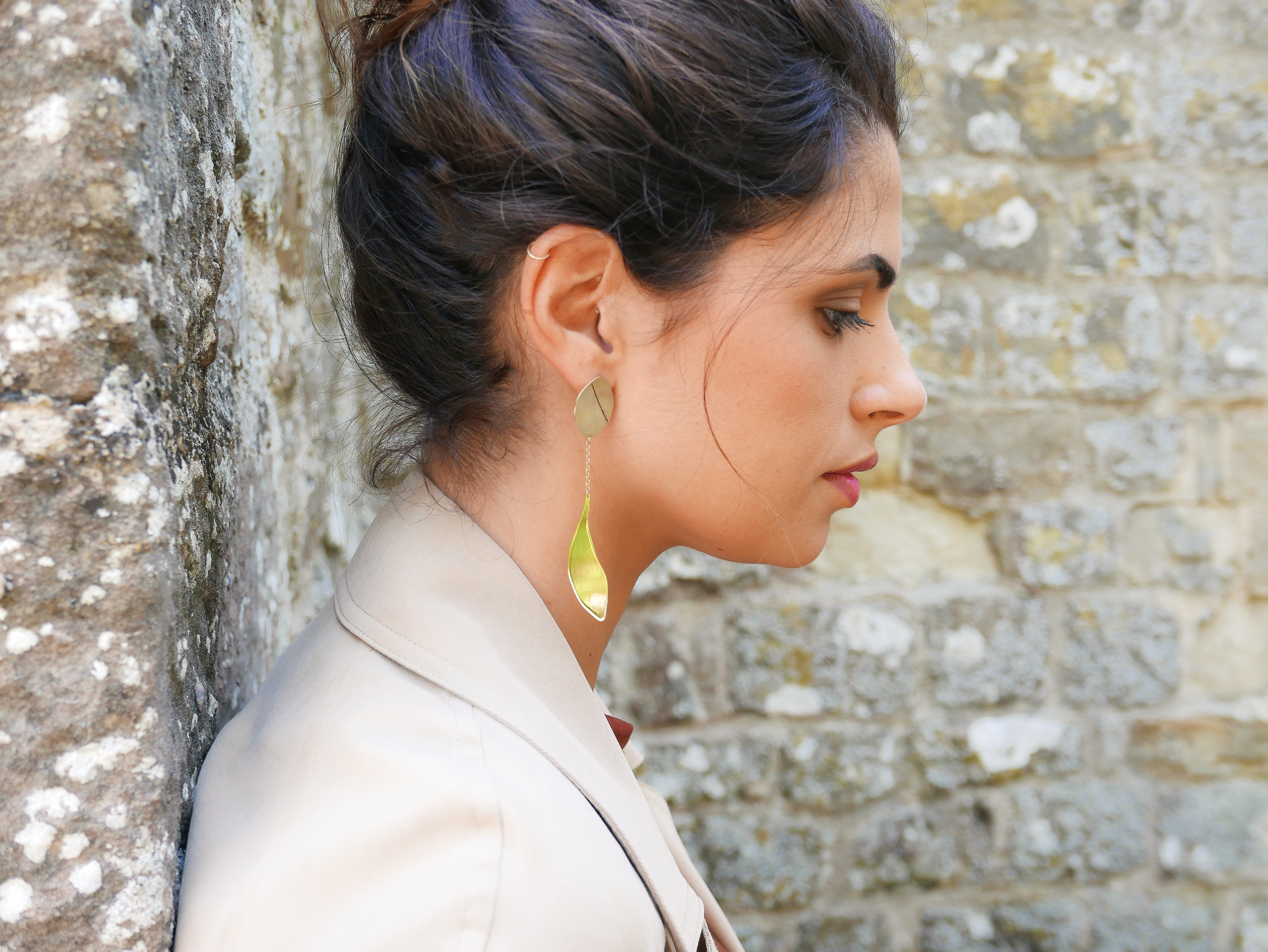 Boucles d’oreilles longues Olea dorées à l’or fin 24 carats. Effet “poli miroir”.