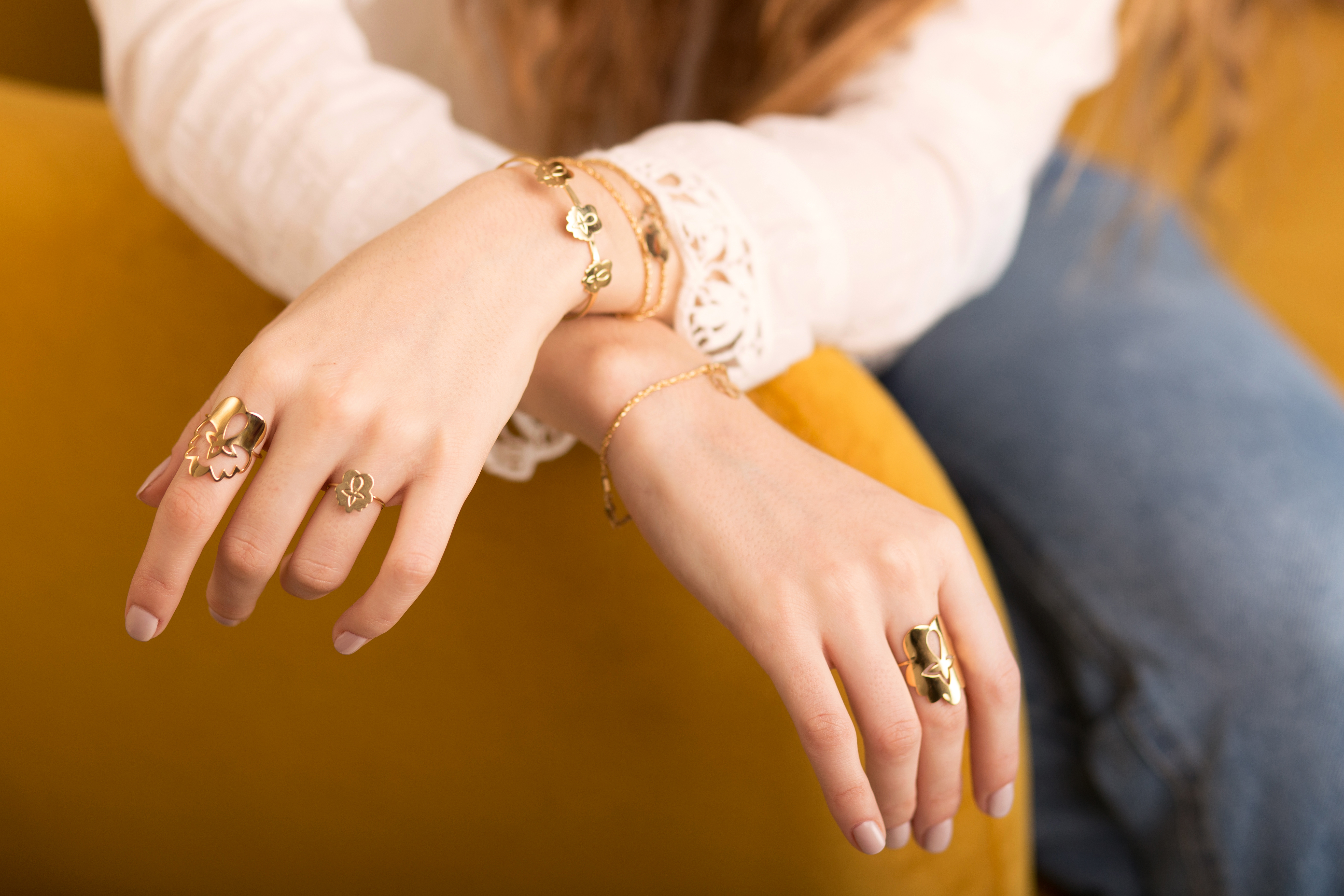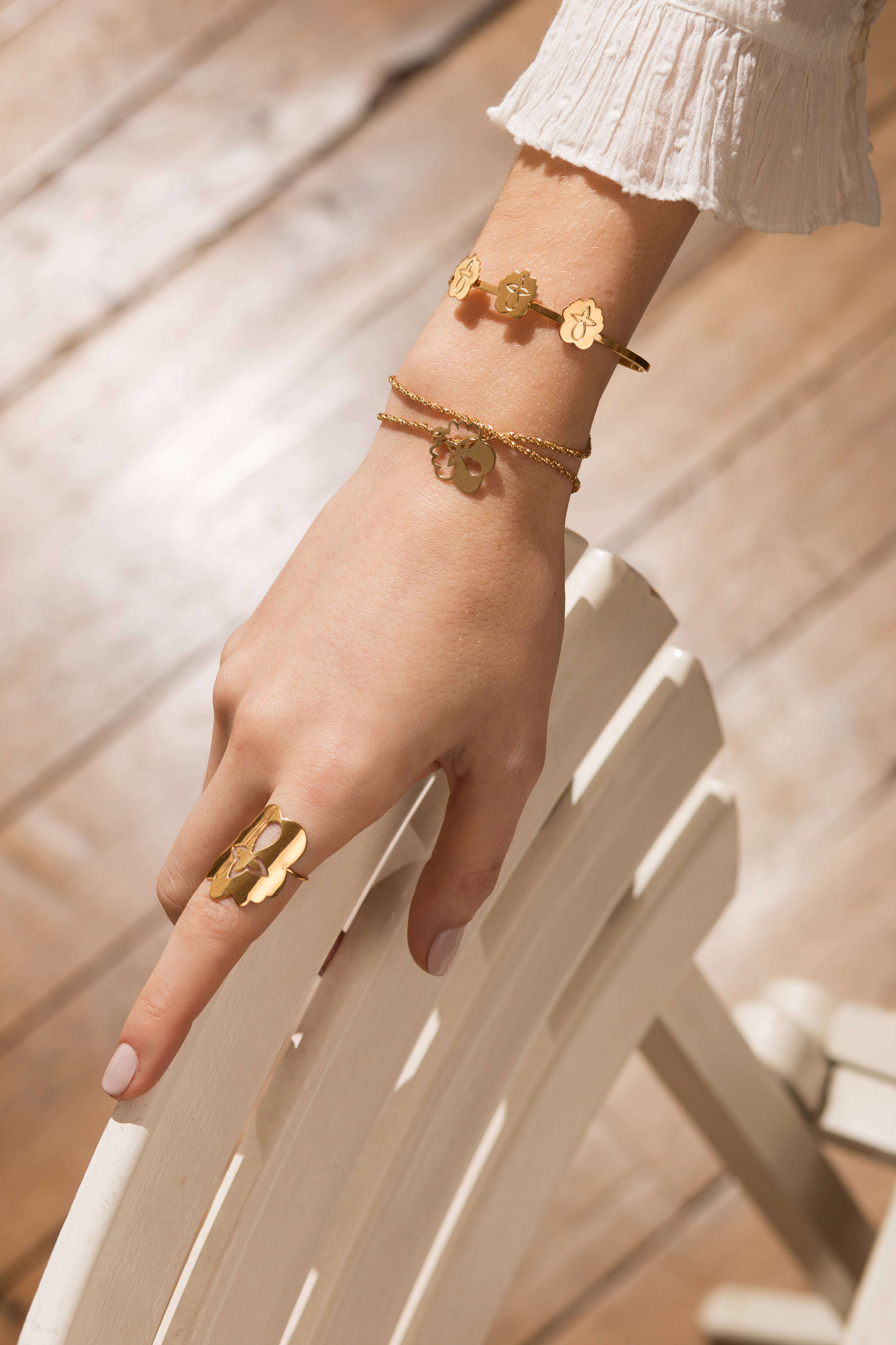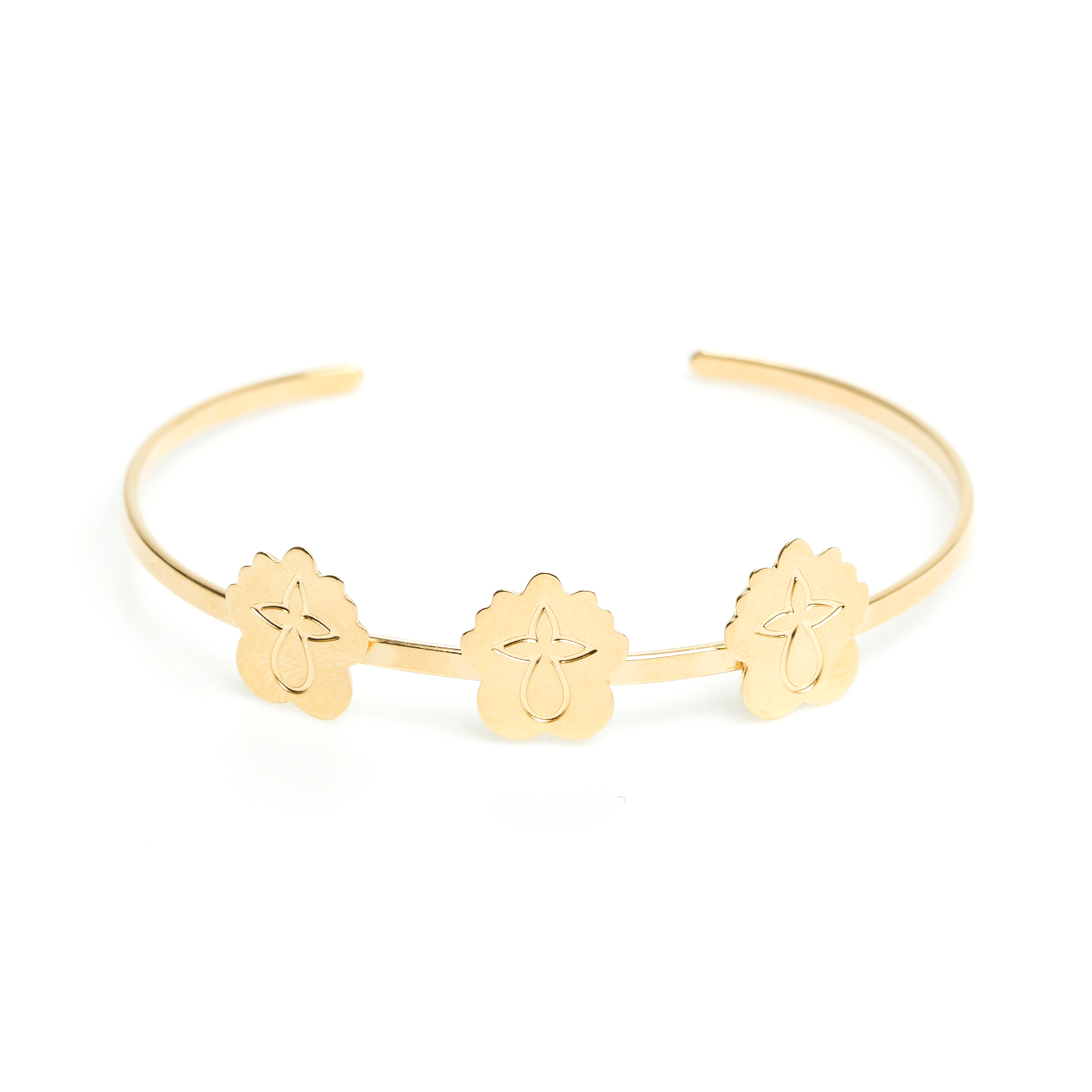 Jonc réglable doré à l’or fin 24 carats composé de trois médailles.